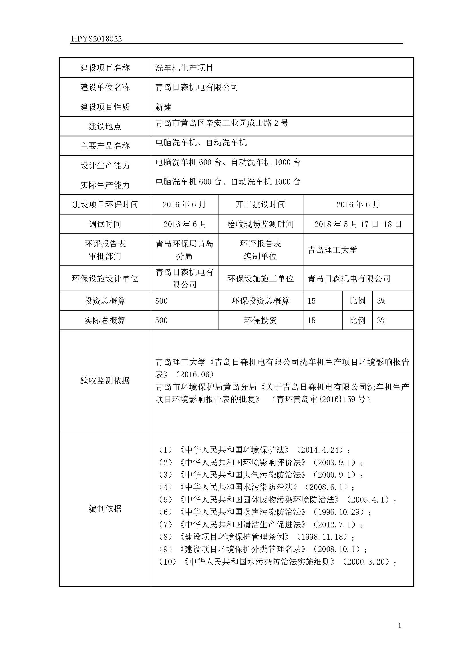 根據《國務院關于修改〈建設項目竣工環境保護管理條例〉的決定》(國務院令第682號),以及環保部《關于發布《建設項目竣工環境保護驗收技術指南 污染影響類》的公告》(國環規環評[2018]9號),現將青島日森機電有限公司洗車機生產項目環境保護竣工驗收情況公示如下: